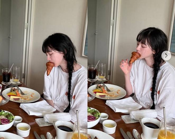 특히 눈을 제대로 뜨지 못한 채 크루아상을 베어 무는 모습이 웃음을 자아낸다. 흐트러진 앞머리와 무표정한 얼굴마저도 청순한 분위기를 자아내 시선을 끌었다.
