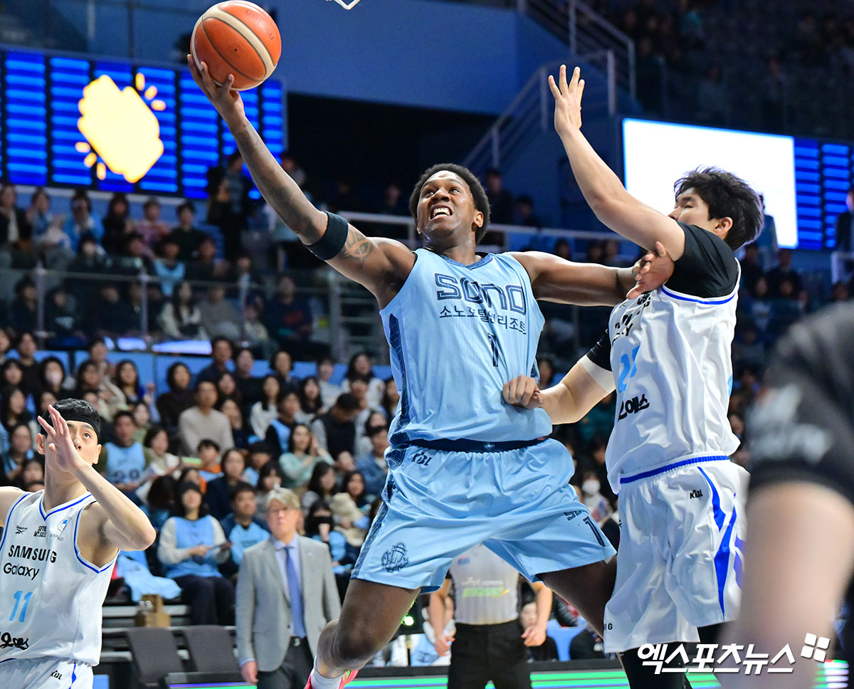 (엑스포츠뉴스 고양, 김한준 기자) 19일 오후 고양 소노아레나에서 열린 2025-2026 LG전자 프로농구 고양 소노와 서울 삼성의 경기, 소노 나이트가 공격을 시도하고 있다.