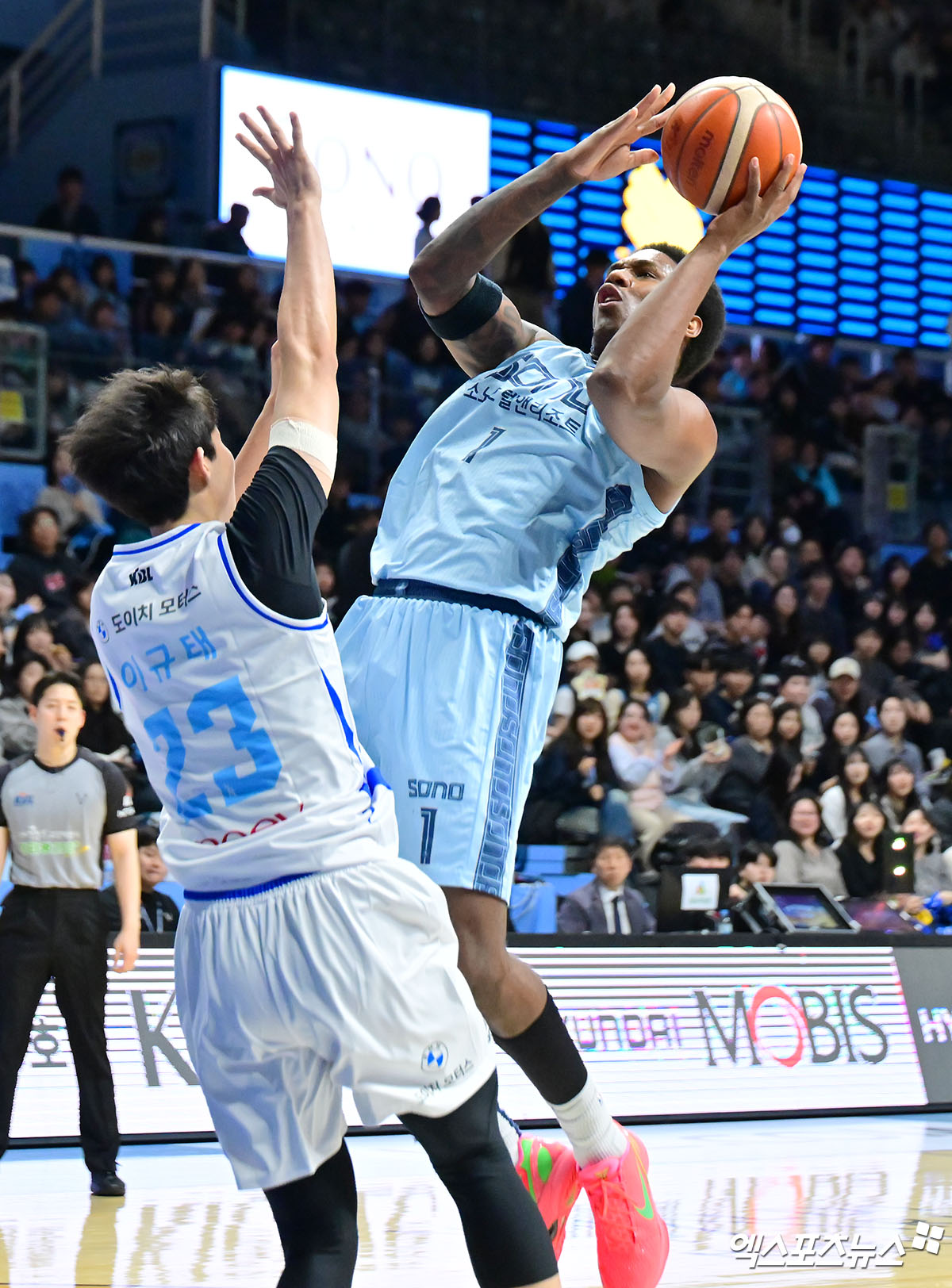 (엑스포츠뉴스 고양, 김한준 기자) 19일 오후 고양 소노아레나에서 열린 2025-2026 LG전자 프로농구 고양 소노와 서울 삼성의 경기, 소노 나이트가 공격을 시도하고 있다.