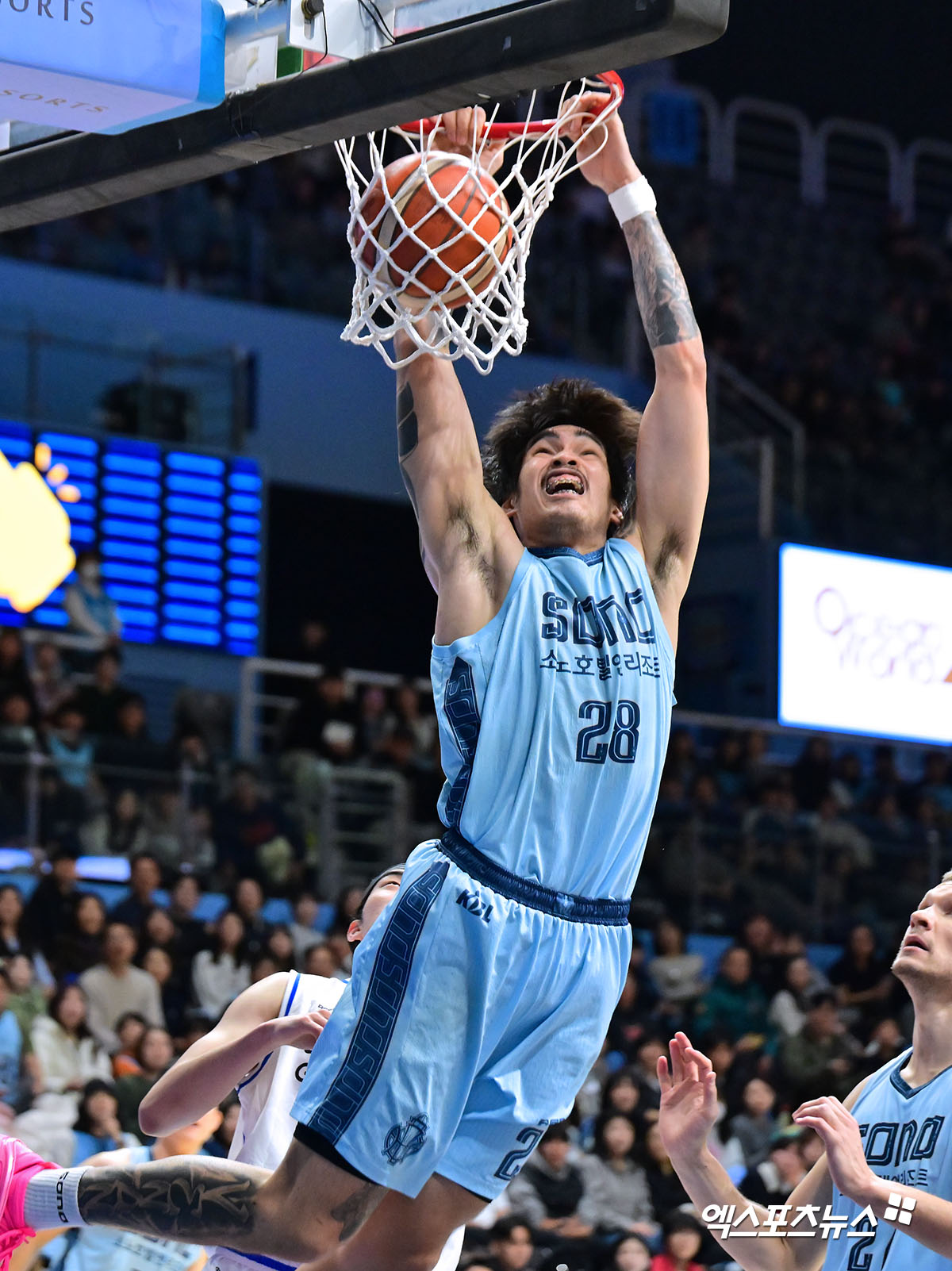 (엑스포츠뉴스 고양, 김한준 기자) 19일 오후 고양 소노아레나에서 열린 2025-2026 LG전자 프로농구 고양 소노와 서울 삼성의 경기, 소노 켐바오가 앨리웁 덩크를 성공시키고 있다.