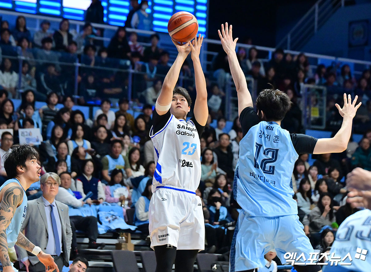 (엑스포츠뉴스 고양, 김한준 기자) 19일 오후 고양 소노아레나에서 열린 2025-2026 LG전자 프로농구 고양 소노와 서울 삼성의 경기, 삼성 이규태가 점프슛을 시도하고 있다.