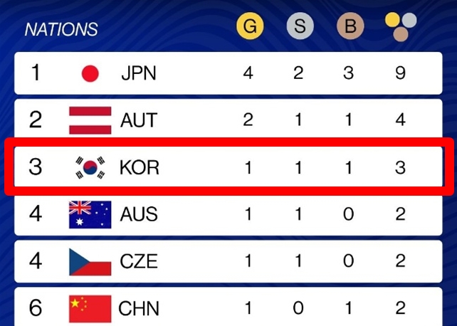 3위는 금메달, 은메달, 동메달을 각각 1개씩 챙긴 한국이 차지했다.