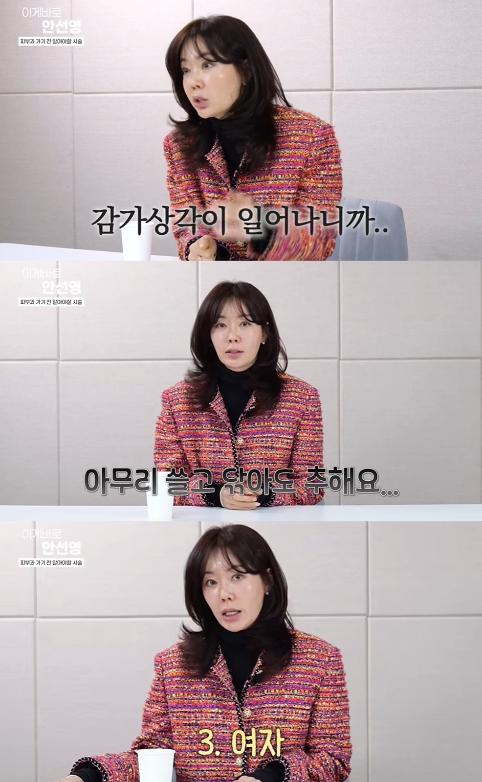 이날 안선영은 자신의 유튜브 채널에서 "집, 차, 여자. 요즘 남자도 마찬가지지만, 연식이 될수록 유지 보수 비용이 많이 들고, 뭔가 보수를 하기 전까지는 아무리 쓸고 닦아도 추하다"고 말했다.