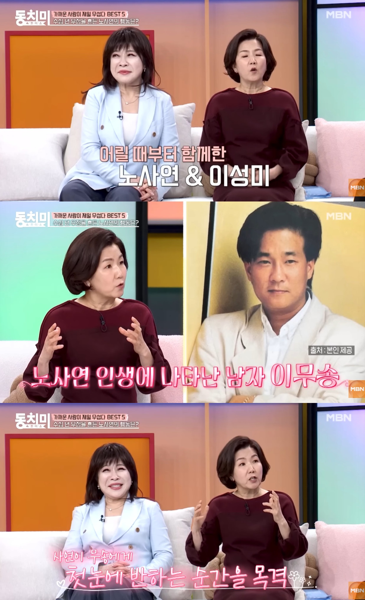 이성미는 "이 언니가 '만남'으로 빵 떴다. 그때 이무송이라는 남자가 나타났다. (이무송의 등장을) 같이 보고 같이 느꼈다. 이 언니 (눈이) 돌아가는 걸 봤다. 남자에게 저렇게 미칠 수 있구나 싶었다"며 과거 노사연이 사랑에 빠지던 순간을 직접 목격했음을 밝혔다.