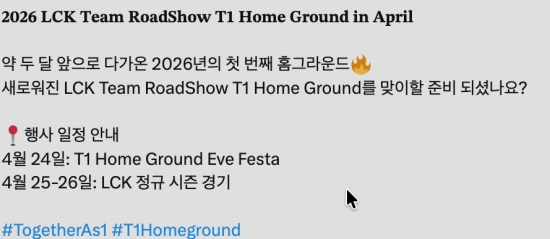 (엑스포츠뉴스 이정범 기자) T1이 4월 '홈그라운드' 행사 구성을 공개했다.