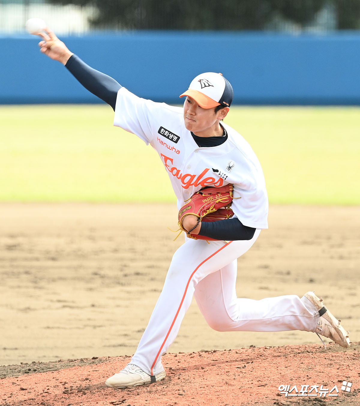 (엑스포츠뉴스 오키나와(일본), 고아라 기자) 21일 오후 일본 오키나와 고친다 구장에서 열린 WBC 대표팀과 한화 이글스의 연습경기, 4회초 한화 박재규가 공을 힘차게 던지고 있다.