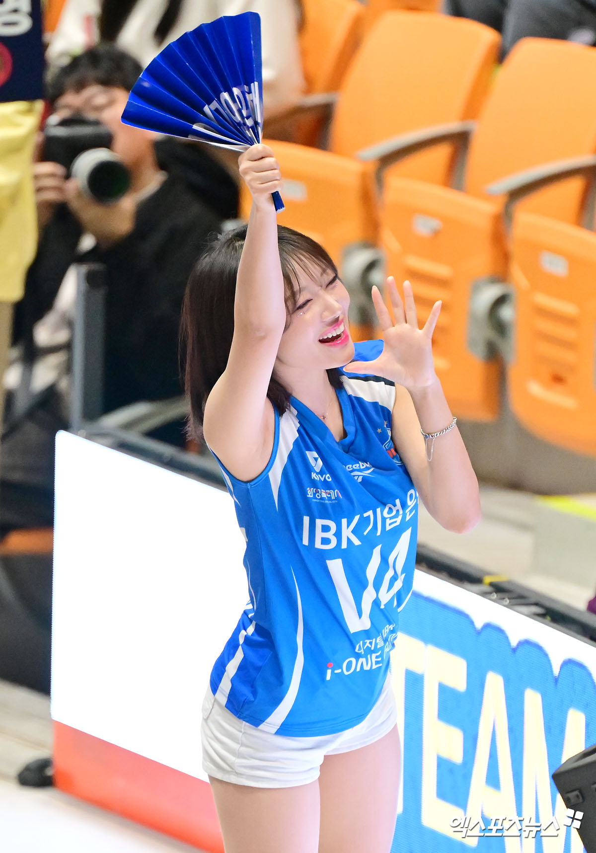 (엑스포츠뉴스 수원, 김한준 기자) 21일 오후 경기도 수원실내체육관에서 열린 '진에어 2025-2026 V-리그' 현대건설과 기업은행의 경기, 박소영 치어리더가 열띤 응원을 선보이고 있다.