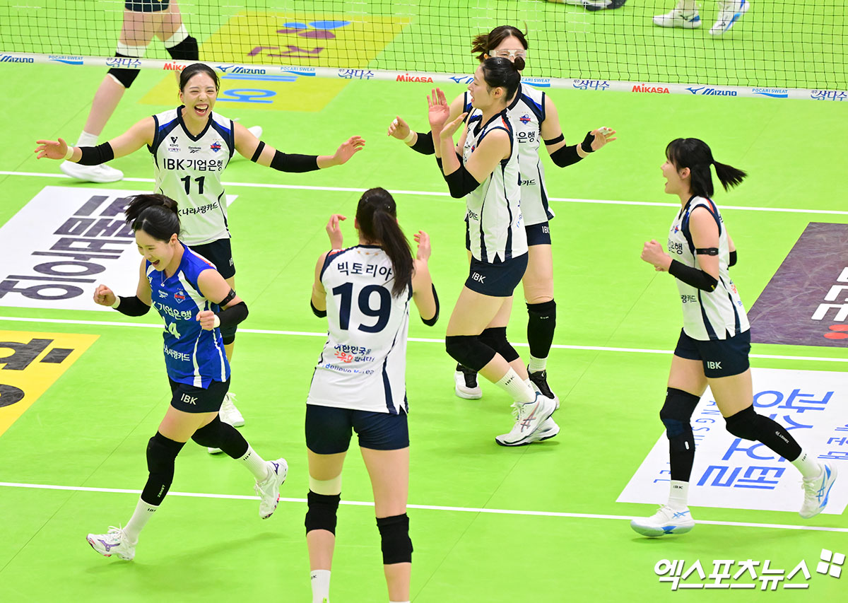 (엑스포츠뉴스 수원, 김한준 기자) 21일 오후 경기도 수원실내체육관에서 열린 '진에어 2025-2026 V-리그' 현대건설과 기업은행의 경기, 기업은행 선수들이 득점 후 기뻐하고 있다.