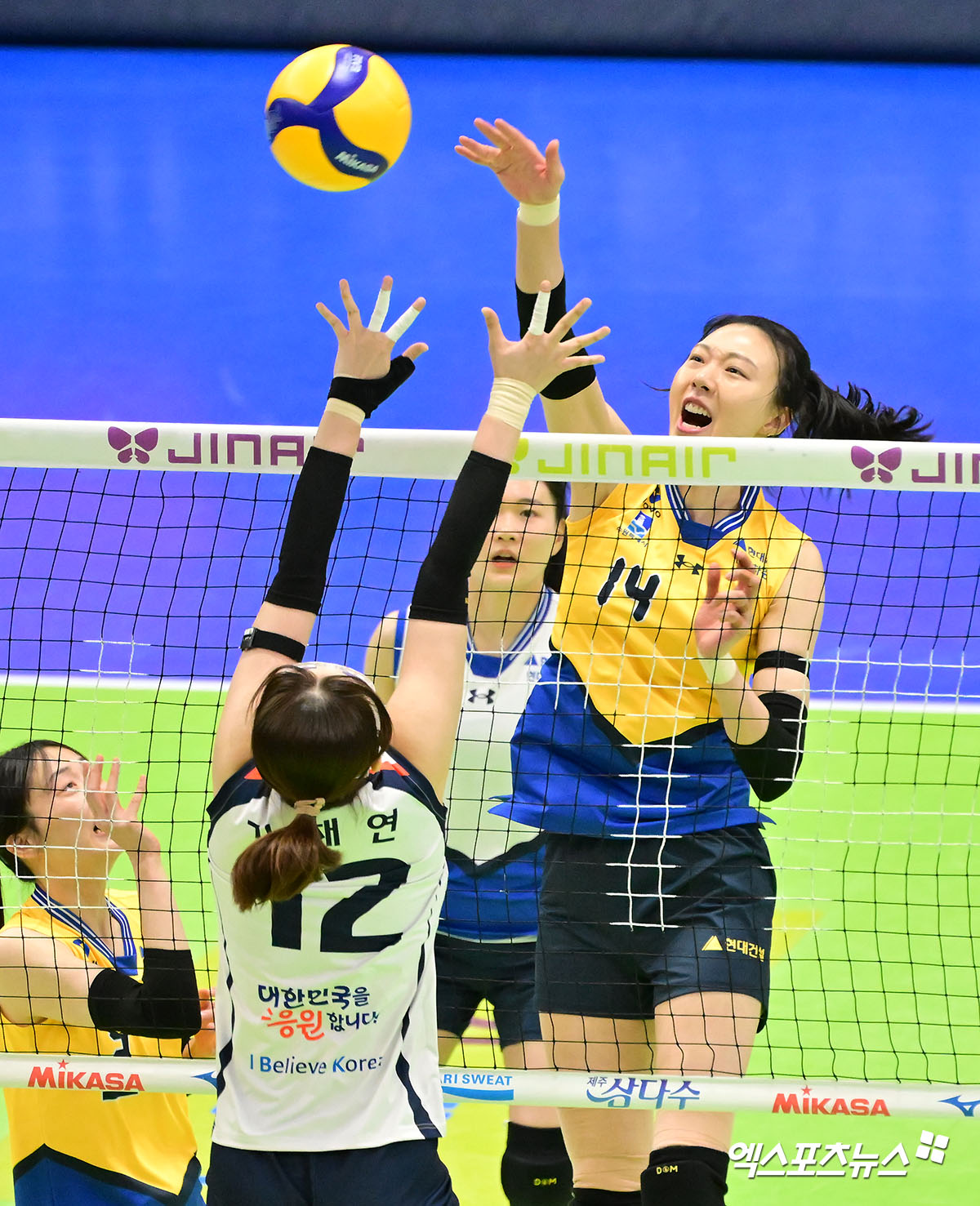 (엑스포츠뉴스 수원, 김한준 기자) 21일 오후 경기도 수원실내체육관에서 열린 '진에어 2025-2026 V-리그' 현대건설과 기업은행의 경기, 현대건설 양효진이 공격을 시도하고 있다.