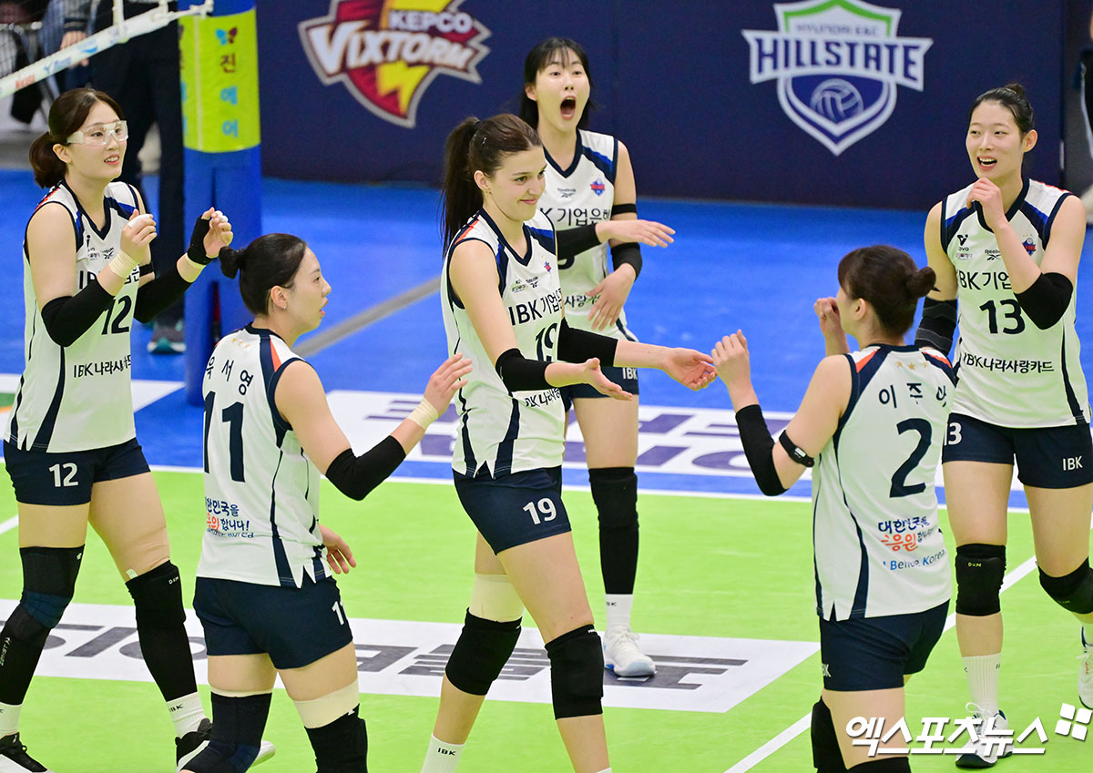 (엑스포츠뉴스 수원, 김한준 기자) 21일 오후 경기도 수원실내체육관에서 열린 '진에어 2025-2026 V-리그' 현대건설과 기업은행의 경기, 기업은행 빅토리아가 기뻐하고 있다.
