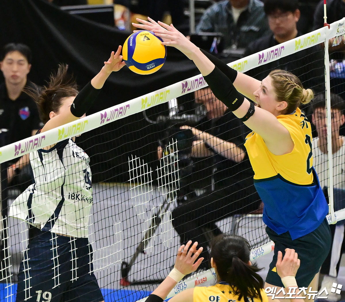 (엑스포츠뉴스 수원, 김한준 기자) 21일 오후 경기도 수원실내체육관에서 열린 '진에어 2025-2026 V-리그' 현대건설과 기업은행의 경기, 현대건설 카리가 블로킹을 하고 있다.