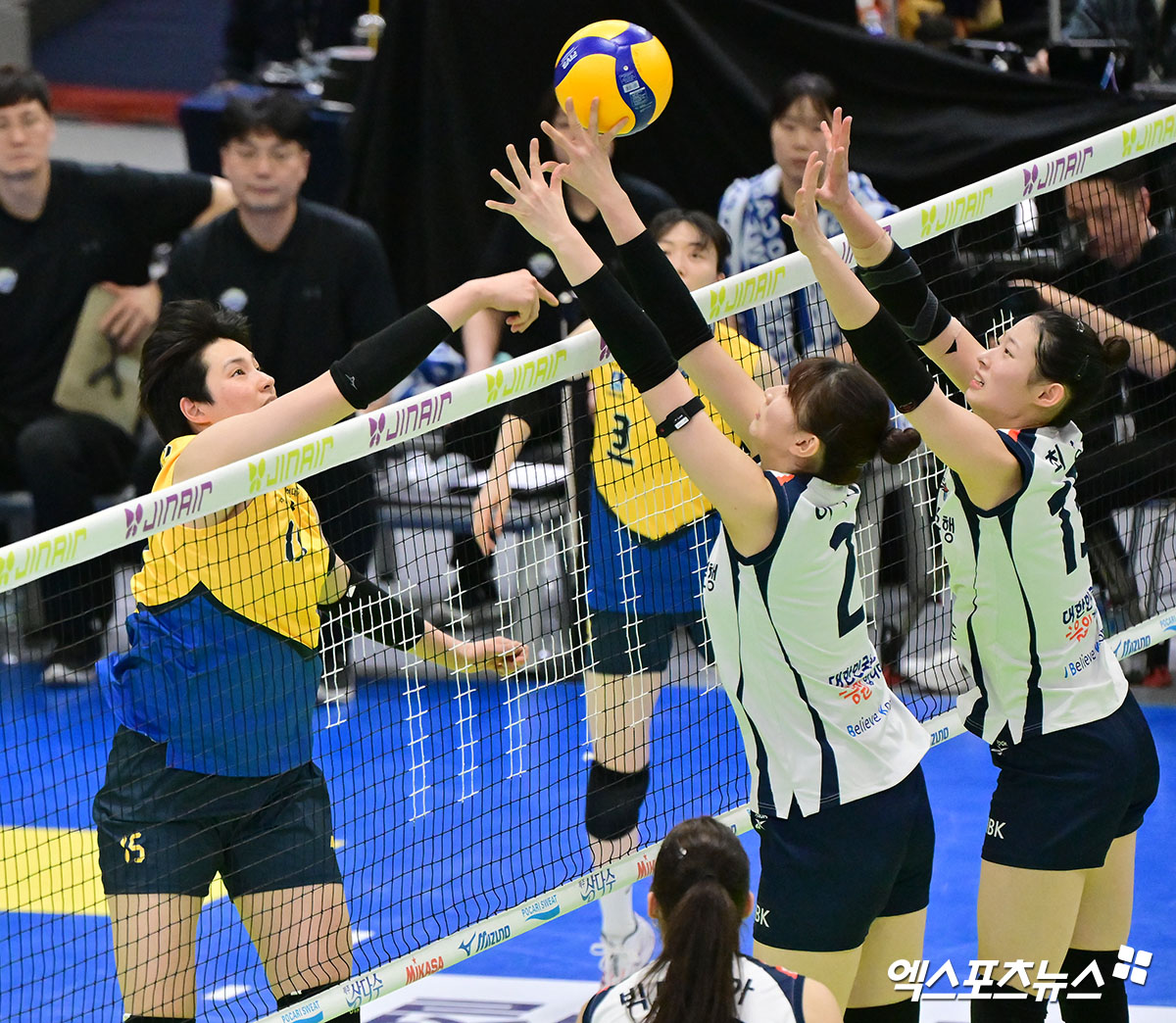 (엑스포츠뉴스 수원, 김한준 기자) 21일 오후 경기도 수원실내체육관에서 열린 '진에어 2025-2026 V-리그' 현대건설과 기업은행의 경기, 현대건설 김희진이 공격을 시도하고 있다.