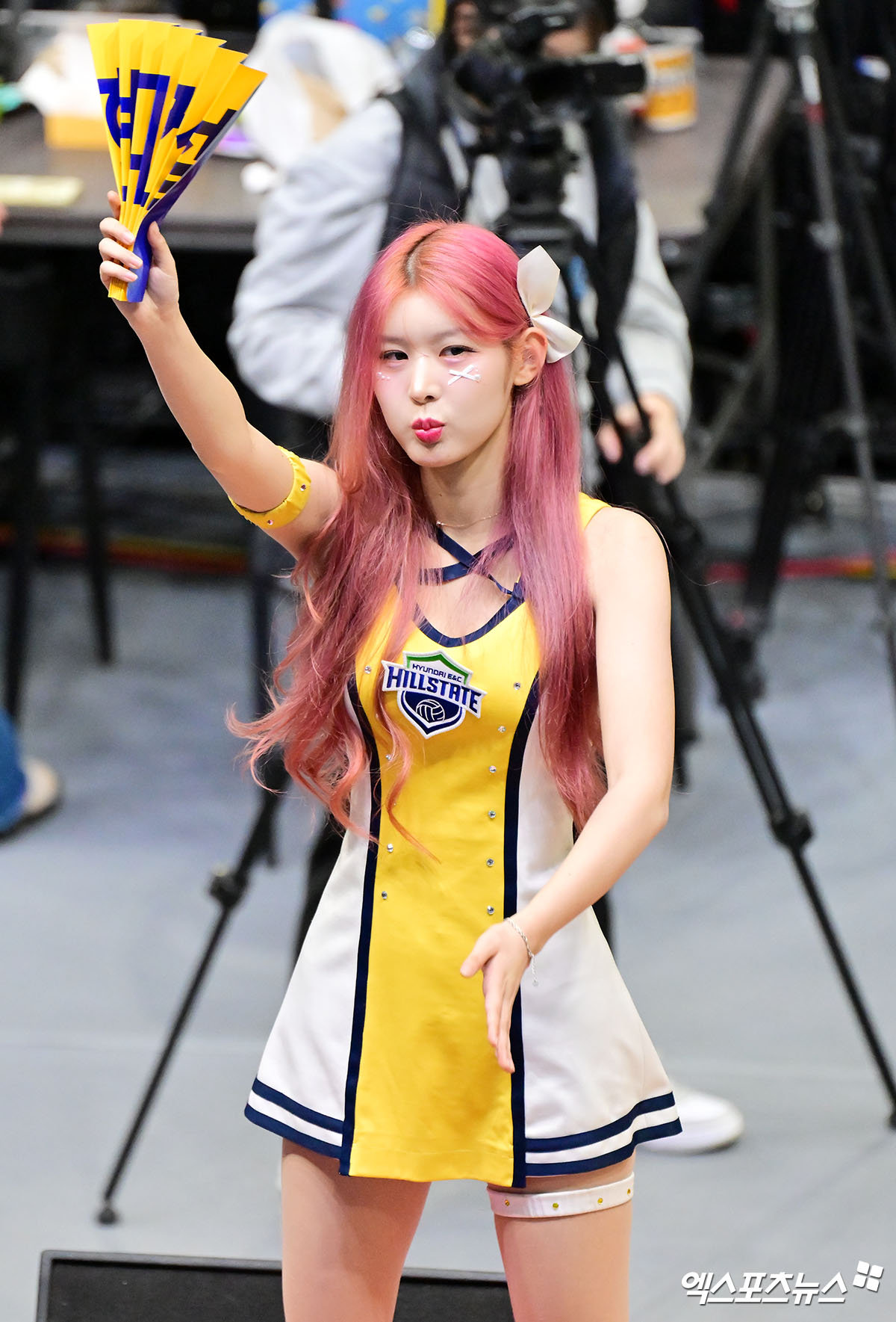 (엑스포츠뉴스 수원, 김한준 기자) 21일 오후 경기도 수원실내체육관에서 열린 '진에어 2025-2026 V-리그' 현대건설과 기업은행의 경기, 신혜령 치어리더가 열띤 응원을 선보이고 있다.