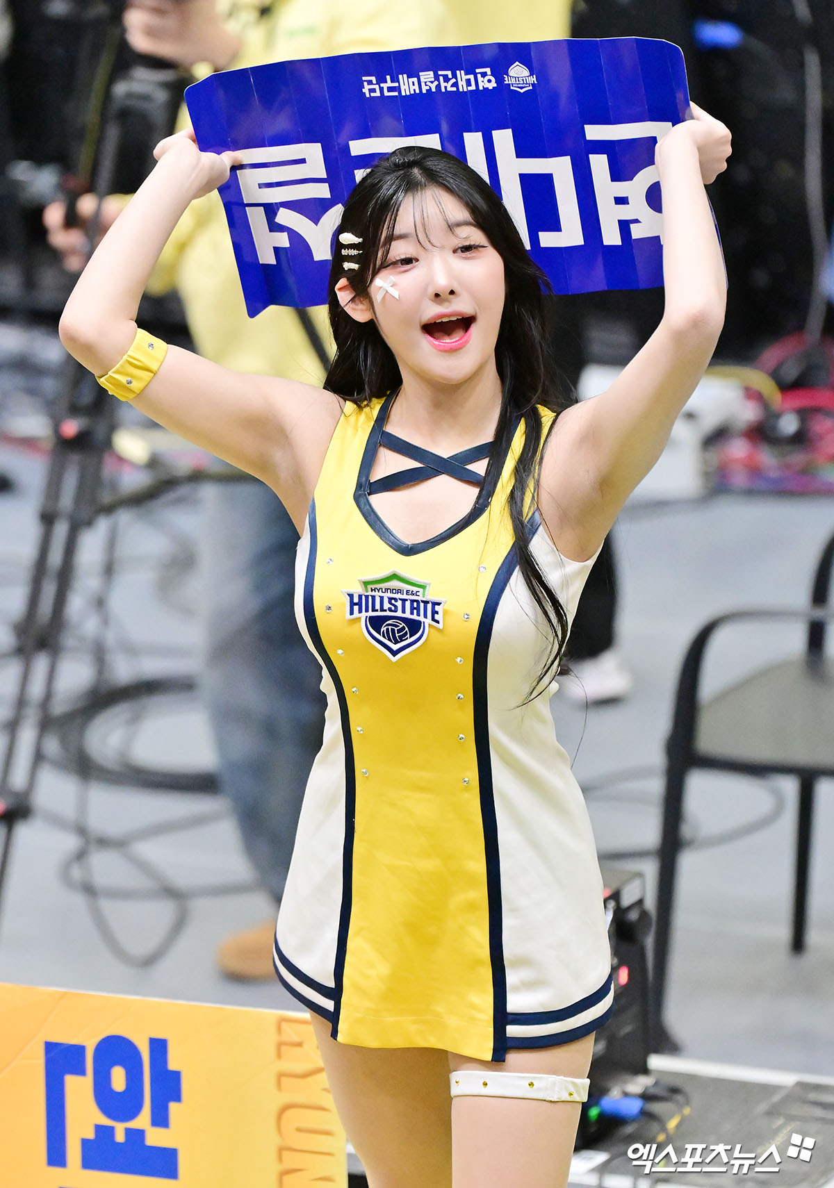 (엑스포츠뉴스 수원, 김한준 기자) 21일 오후 경기도 수원실내체육관에서 열린 '진에어 2025-2026 V-리그' 현대건설과 기업은행의 경기, 고가빈 치어리더가 열띤 응원을 선보이고 있다.