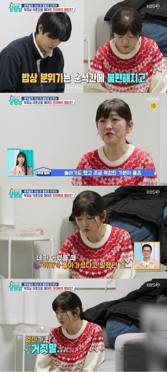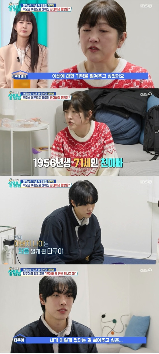 타쿠야 어머니는 '살림남' 방송을 너튜브로 봤다는 얘기를 했다. 타쿠야는 지난 방송에서 부모님의 이혼 사실을 공개한 후 여동생과는 친아버지 대한 얘기를 나눴었다.