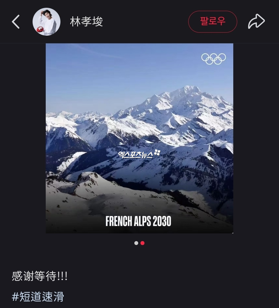 린샤오쥔은 특히 2030 프랑스 알프스 올림픽 관련 사진을 함께 게재해 한 번 더 올림픽에 나가고 싶은 의지를 드러냈다.