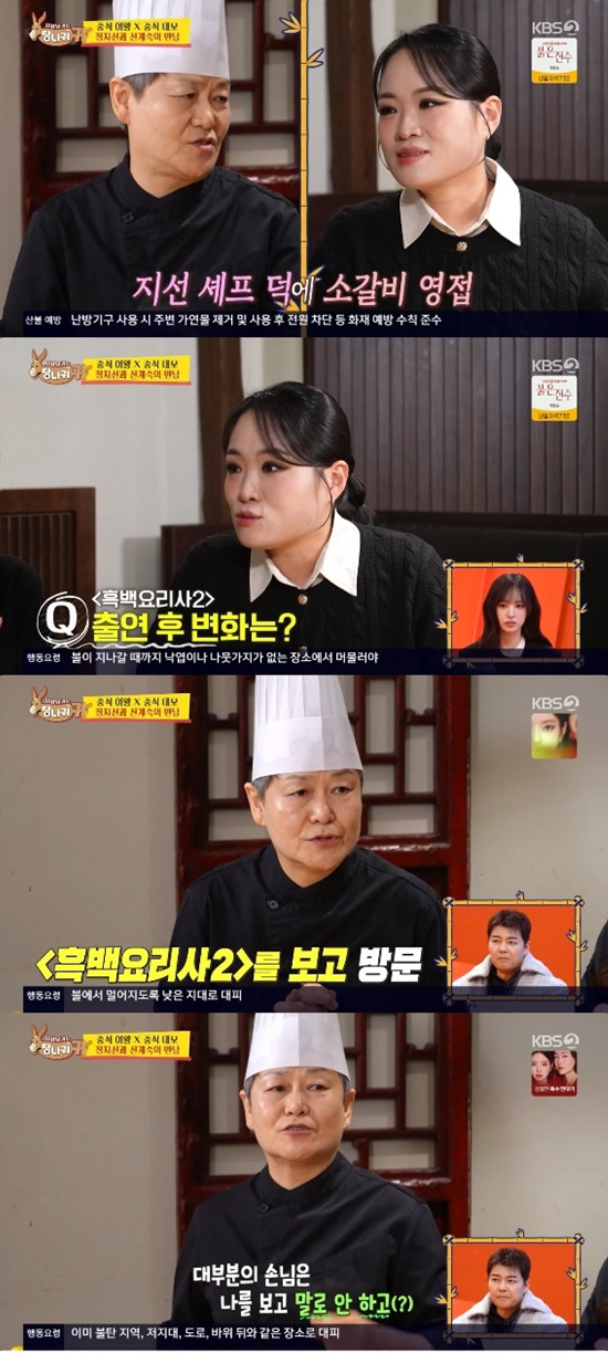 신계숙은 정지선이 '흑백요리사2' 출연이 후회되지는 않는지 묻자 "오히려 잘됐지. 더 올라가서 지선 셰프처럼 바빠지면 어떡해"라며 손님은 이전보다 20% 증가했다고 전했다.