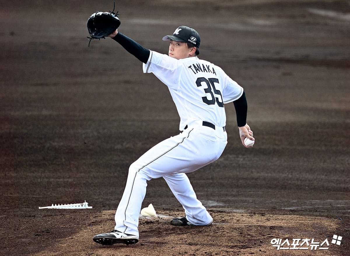 (엑스포츠뉴스 오키나와(일본), 고아라 기자) 22일 오후 일본 오키나와 니시자키 구장에서 열린 한화 이글스와 지바 롯데 마린스와의 연습경기, 1회초 지바 롯데 선발투수 타나카 하루야가 공을 힘차게 던지고 있다.