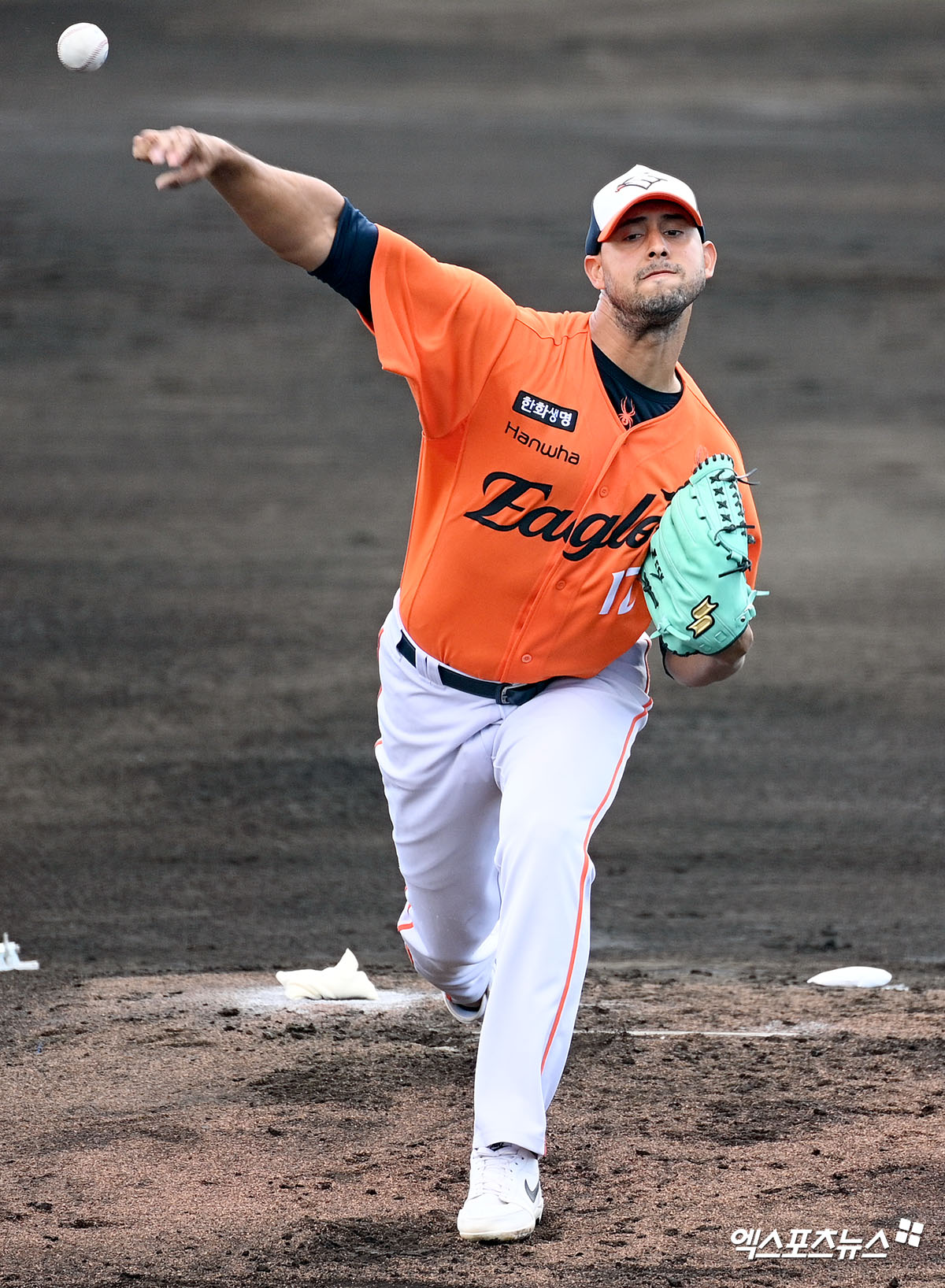 (엑스포츠뉴스 오키나와(일본), 고아라 기자) 22일 오후 일본 오키나와 니시자키 구장에서 열린 한화 이글스와 지바 롯데 마린스와의 연습경기, 1회말 한화 선발투수 에르난데스가 공을 힘차게 던지고 있다.