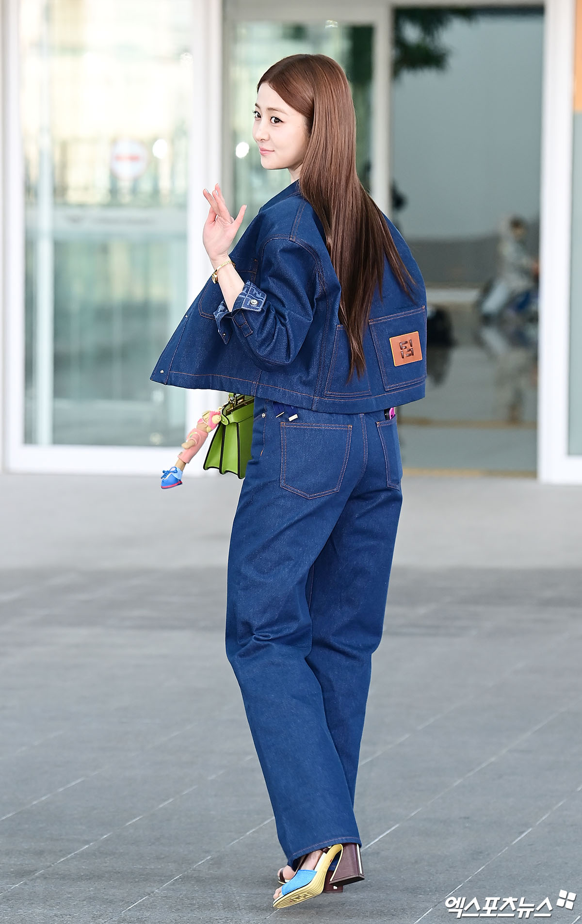 르세라핌 허윤진, 마네킹 비율로 완성한 청청 패션