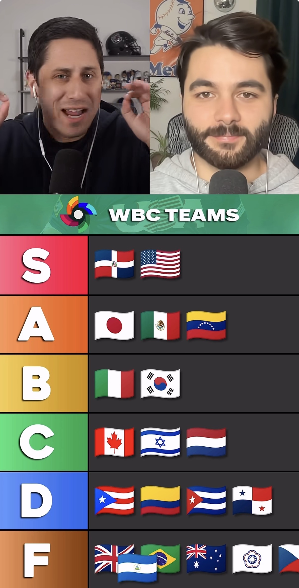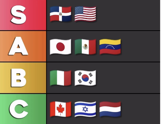 가장 높은 S등급엔 미국과 도미니카공화국이 이름을 올렸다. 진행자들은 미국에 대해 "우리가 모두 기대하는 팀"이라며 "폴 스킨스, 타릭 스쿠발, 데이비드 베드너 등을 포함한 풍성한 투수진과 불펜은 대회 최고 수준"이라고 평가했다. 도미니카공화국 역시 "토너먼트 최강 후보 중 하나"라며 "투수진, 타선 모두 압도적"이라고 극찬했다.