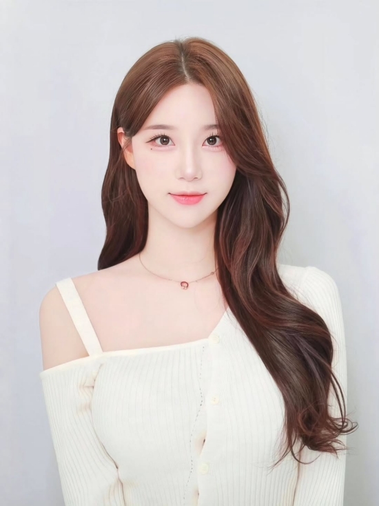 사진에서 김현영은 염색한 긴 머리에 한쪽 어깨만 드러난 흰색 상의를 입고 있다.