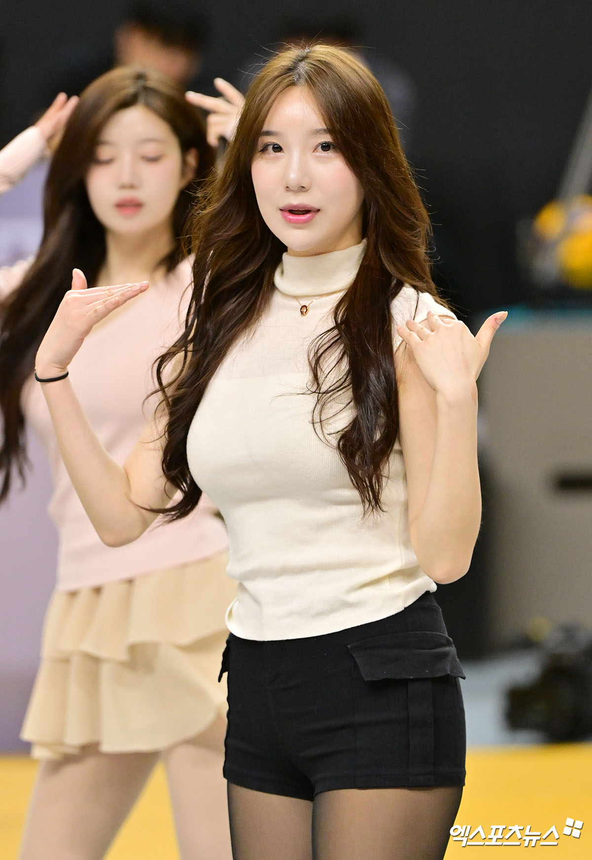 (엑스포츠뉴스 의정부, 김한준 기자) 24일 오후 경기도 의정부 경민대체육관에서 열린 '진에어 2025-2026 V-리그' KB손해보험과 삼성화재의 경기, 경기 전 김현영 치어리더가 리허설에 임하고 있다.