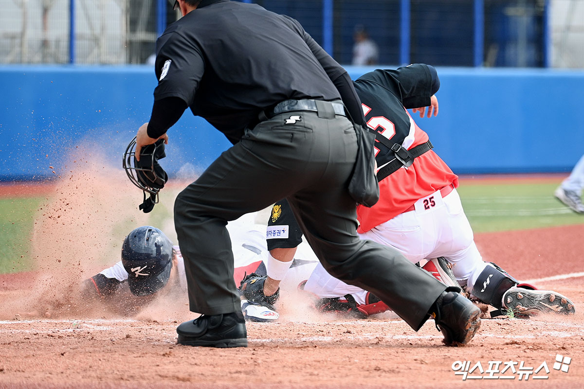 (엑스포츠뉴스 오키나와(일본), 고아라 기자) 24일 일본 오키나와 카데나 구장에서 열린 KIA 타이거즈와 WBC 대표팀의 연습경기, 3회말 1사 2,3루 대표팀 신민재 타석 때 문현빈이 홈쇄도를 시도하다 아웃되고 있다.