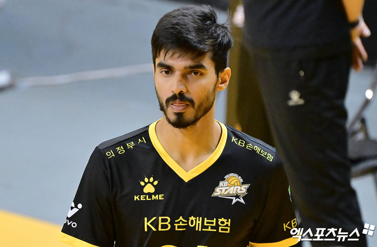 (엑스포츠뉴스 의정부, 김한준 기자) 24일 오후 경기도 의정부 경민대체육관에서 열린 '진에어 2025-2026 V-리그' KB손해보험과 삼성화재의 경기, KB손해보험 아밋이 연습에 임하고 있다.
