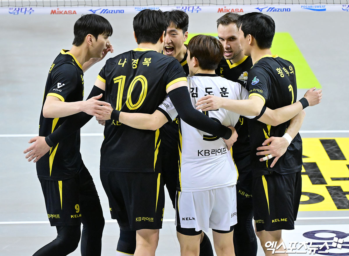(엑스포츠뉴스 의정부, 김한준 기자) 24일 오후 경기도 의정부 경민대체육관에서 열린 '진에어 2025-2026 V-리그' KB손해보험과 삼성화재의 경기, KB손해보험 선수들이 기뻐하고 있다.