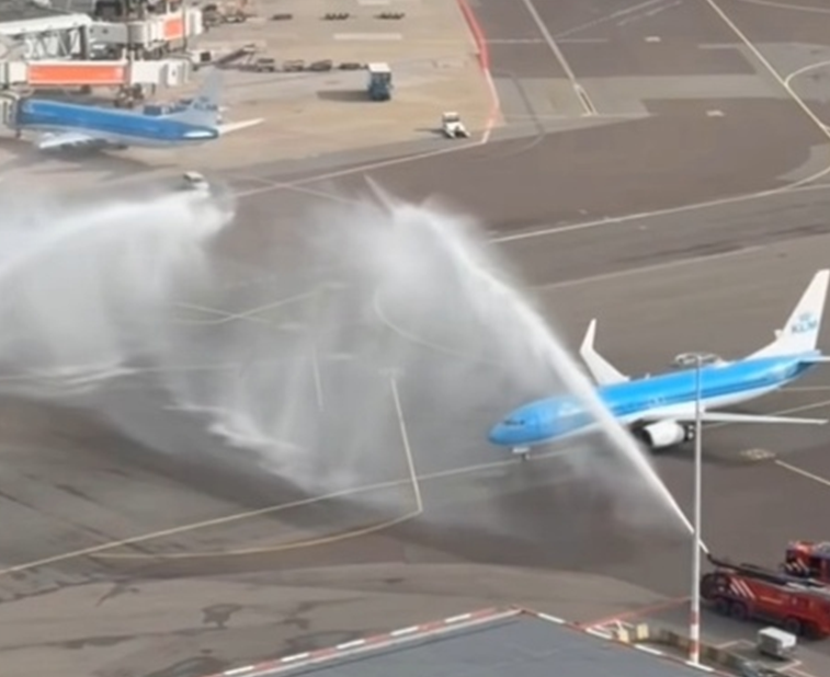 네덜란드 최대 공항인 암스테르담의 스키폴 공항 SNS를 24일 선수단을 태운 네덜란드항공편이 활주로에 도착해 게이트 쪽으로 향할 때 소방차 2대가 양쪽에 자리잡아 물대포 뿌리는 장면을 공개했다.