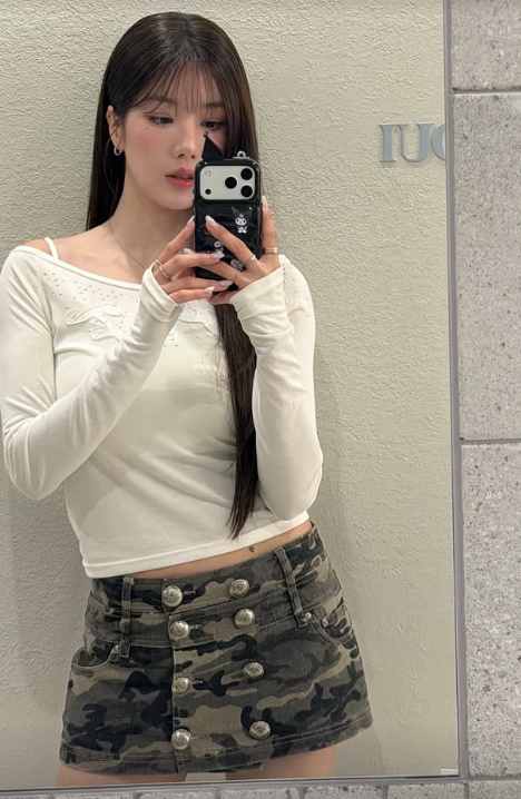 공개된 사진 속 권은비는 밀리터리 패턴의 미니스커트에 슬림핏 상의를 매치해 스타일리시한 룩을 완성했다. 버튼 디테일이 돋보이는 스커트는 각선미를 더욱 부각시키며 시선을 사로잡는다.