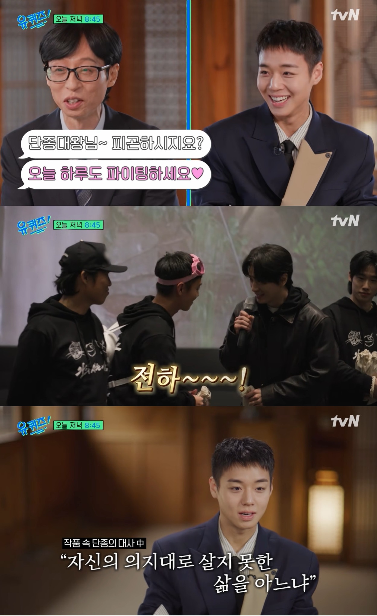 이날 박지훈은 "단종이니 가족들의 인사도 바뀌지 않냐"는 유재석의 질문에 "'단종대왕님 피곤하시지요' 이런다. 가족들이 말투가 바뀌어 있다"고 이야기하며 영화 '왕과 사는 남자' 출연 후 변화를 이야기했다.