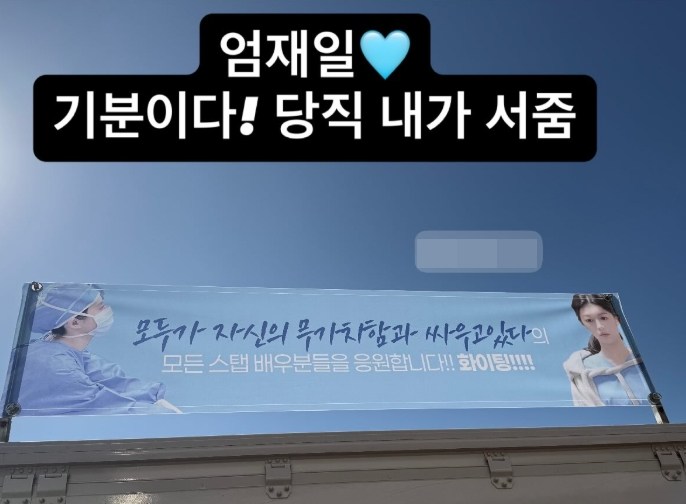 현수막에는 "'모두가 자신의 무가치함과 싸우고 있다'의 모든 스탭 배우 분들을 응원합니다!! 화이팅!!!"이라는 애정어린 문구가 쓰여 있다.