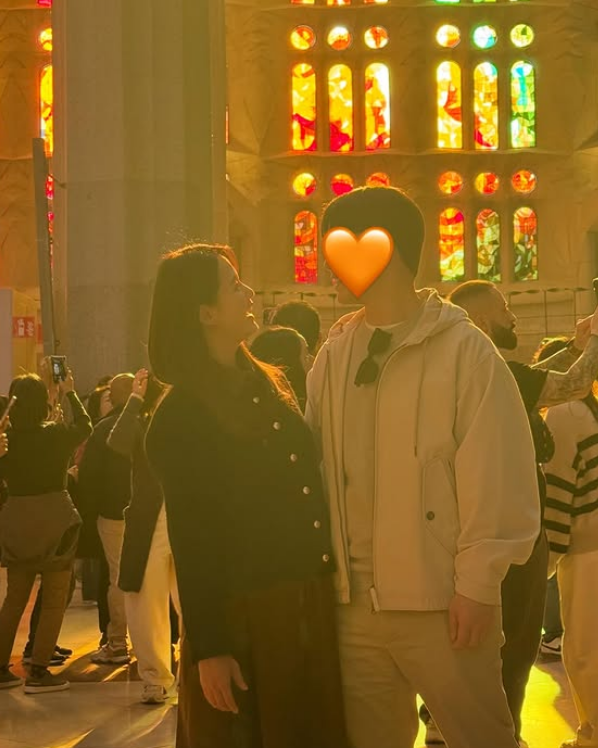 남보라는 성당을 배경으로 남편과 다정하게 서서 서로를 바라보고 있다. 비록 남편의 얼굴은 이모지로 가렸지만 신혼의 달달한 분위기가 고스란히 전해졌다.
