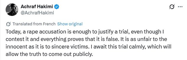 반면 유부남인 하키미 측은 혐의를 전면 부인하며 억울함을 호소하고 있다. 하키미는 SNS를 통해 "오늘날에는 성폭행 혐의만으로도 재판에 회부되기에 충분하다"며 "이는 무고한 사람과 진정한 피해자 모두에게 부당한 일이며, 침착하게 재판을 기다리는 동안 진실이 밝혀질 것"이라고 강력히 항변했다.