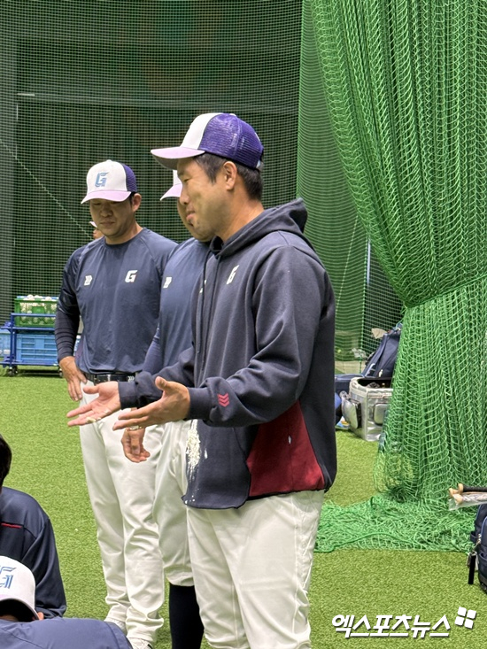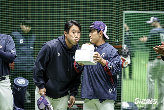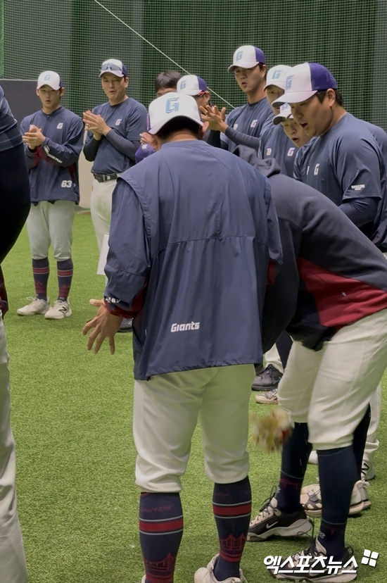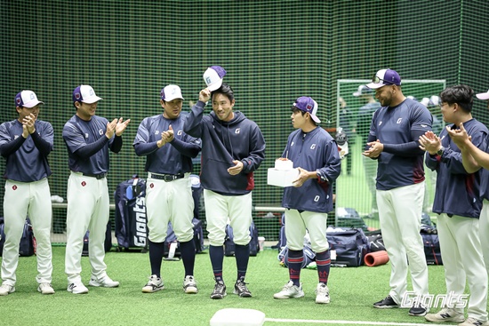 본격적인 훈련에 들어가기 전, 선수들이 모여 간단한 미팅을 가졌다. 그런데 이 대열에 외야수 황성빈은 빠져 있었다. 대신 그는 연습장 한켠에서 구단이 준비한 케이크를 들고 있었다. 어떻게 된 일일까.