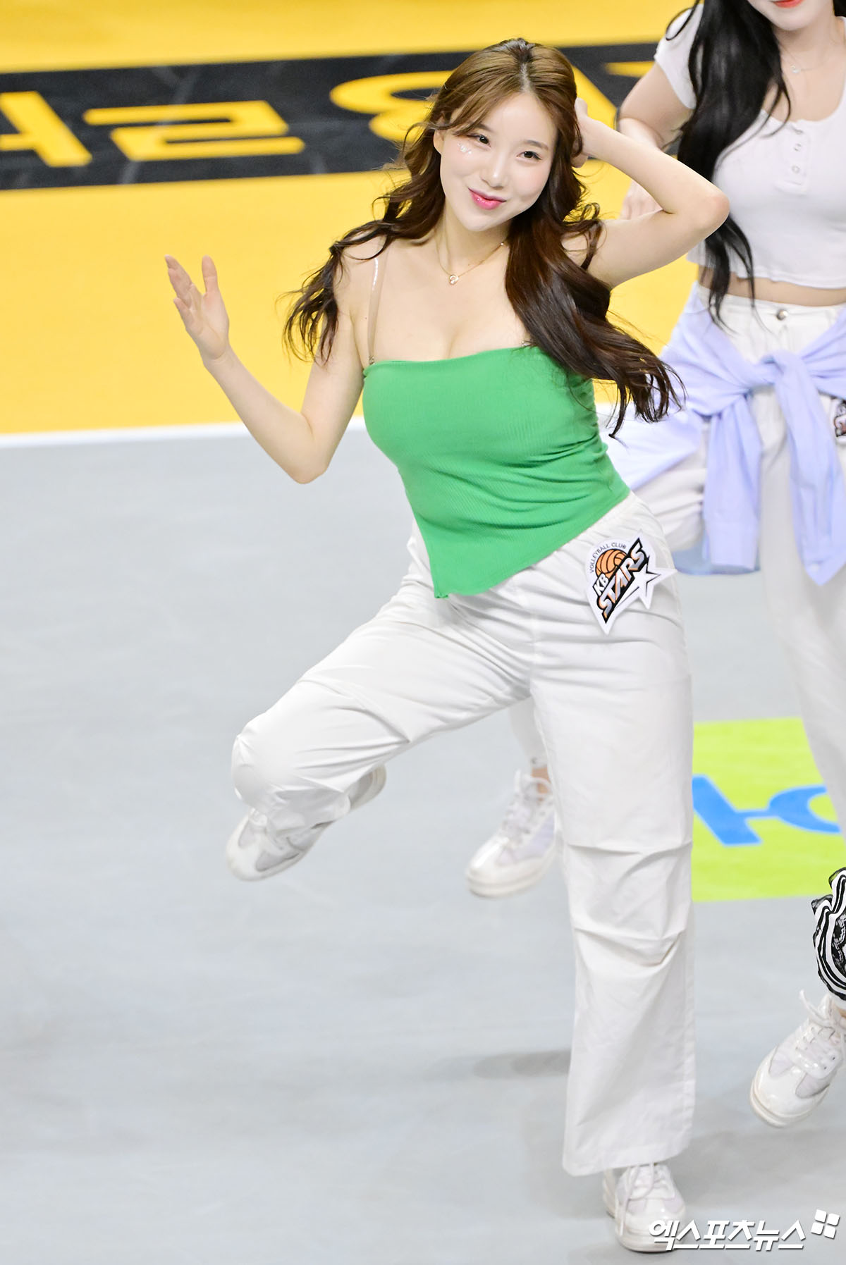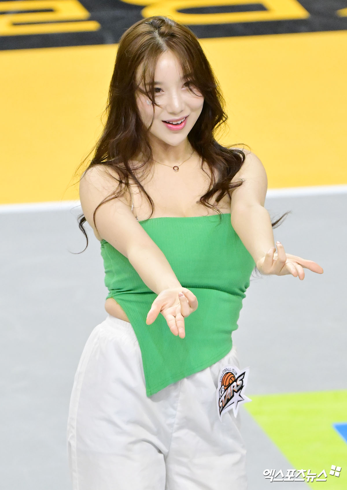 초록색 민소매 상의를 입은 김현영은 E컵 치어리더라는 별명 답게 볼륨감 넘치는 가슴 라인과 깨끗한 겨드랑이 라인을 과감하게 드러내며 섹시함을 한층 더 끌어올렸다.