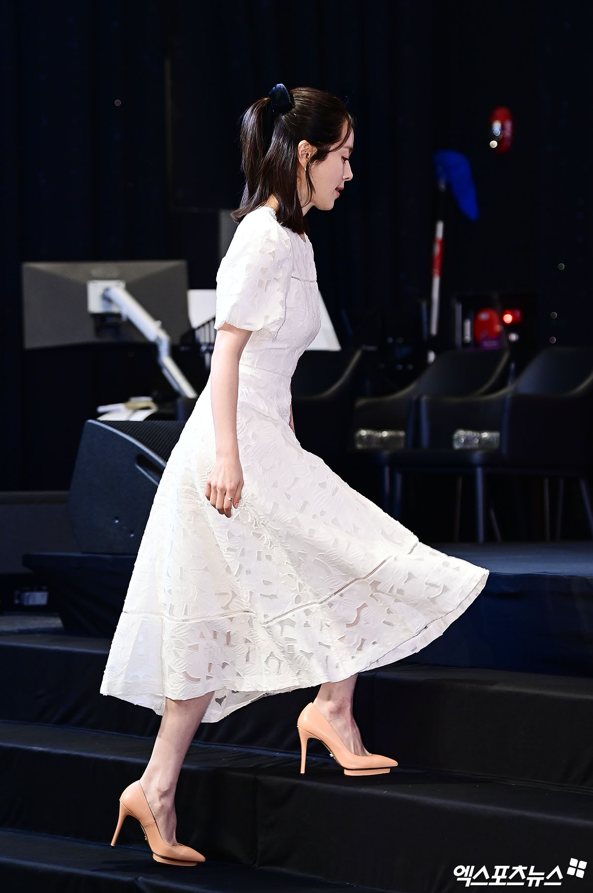 여기에 드레스의 화이트 톤과 자연스럽게 어울리는 스킨톤의 가보시 힐을 매치해 다리가 더욱 길어 보이게 했고, 액세서리를 최소화하며 의상의 디테일을 살렸다. 앞머리 없이 깔끔하게 넘긴 반묶음 헤어에 리본 핀으로 사랑스러운 매력을 더했다.