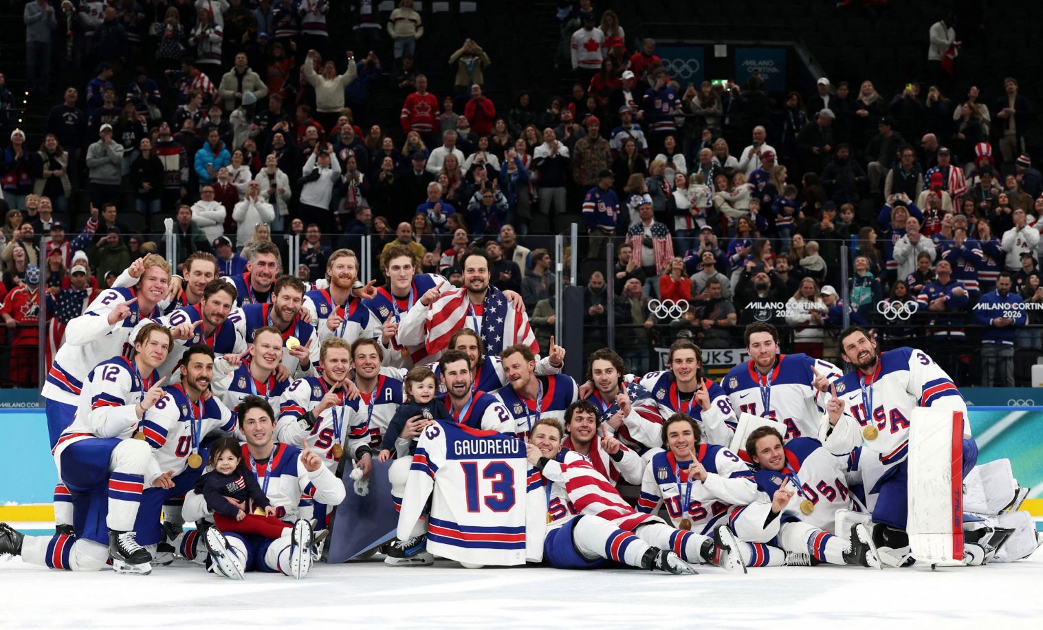 영상에는 지난 23일 캐나다와의 결승전에서 연장 접전 끝에 승리하며 금메달을 딴 아이스하키 대표팀 선수들이 미국 국기와 오륜기가 새겨진 네이비색 스웨터를 맞춰 입고 등장하는 장면이 담겼다.
