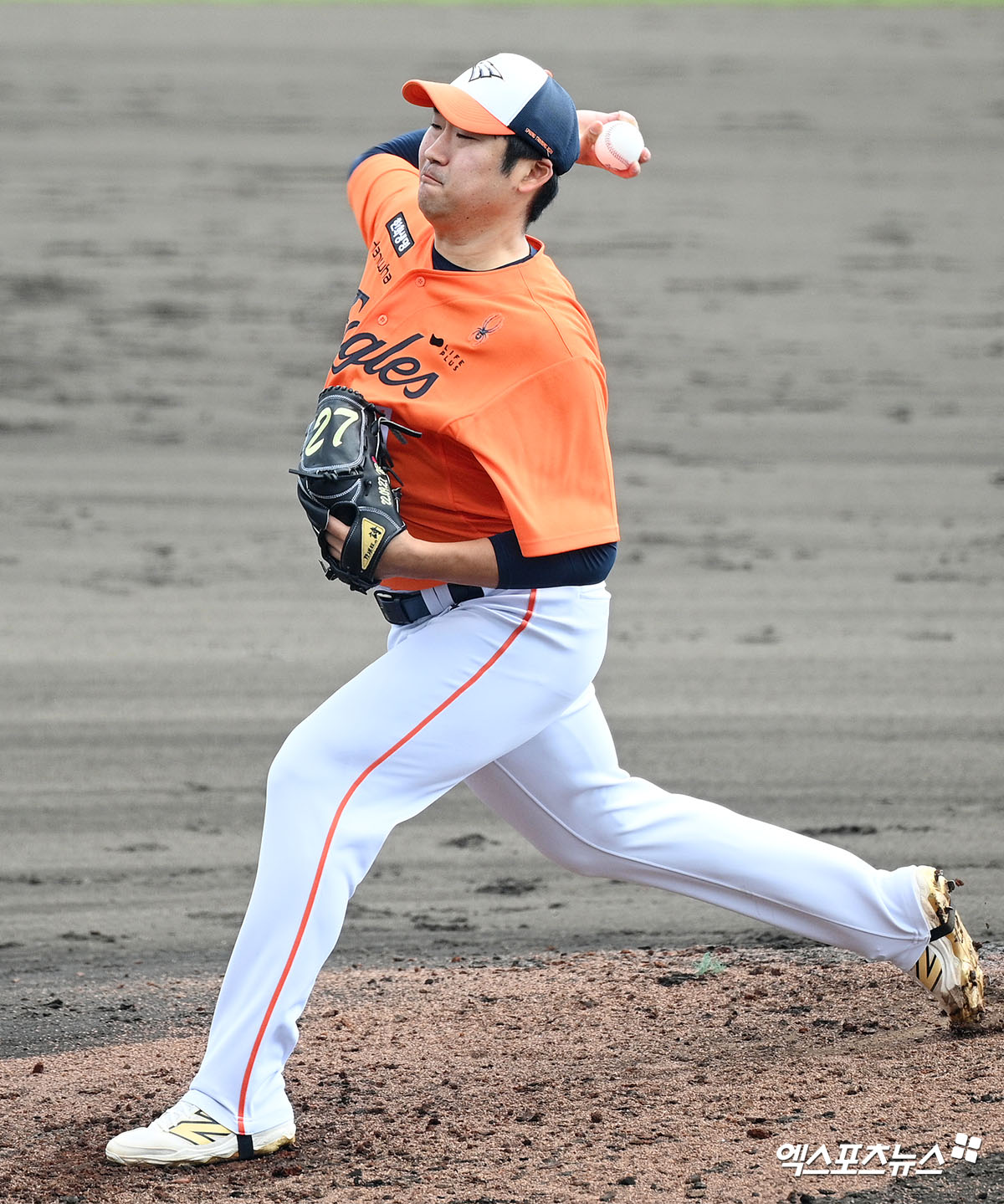 (엑스포츠뉴스 오키나와(일본), 고아라 기자) 26일 오후 일본 오키나와 나고시영 구장에서 열린 한화 이글스와 닛폰햄 파이터스의 연습경기, 5회말 한화 이민우가 공을 힘차게 던지고 있다.