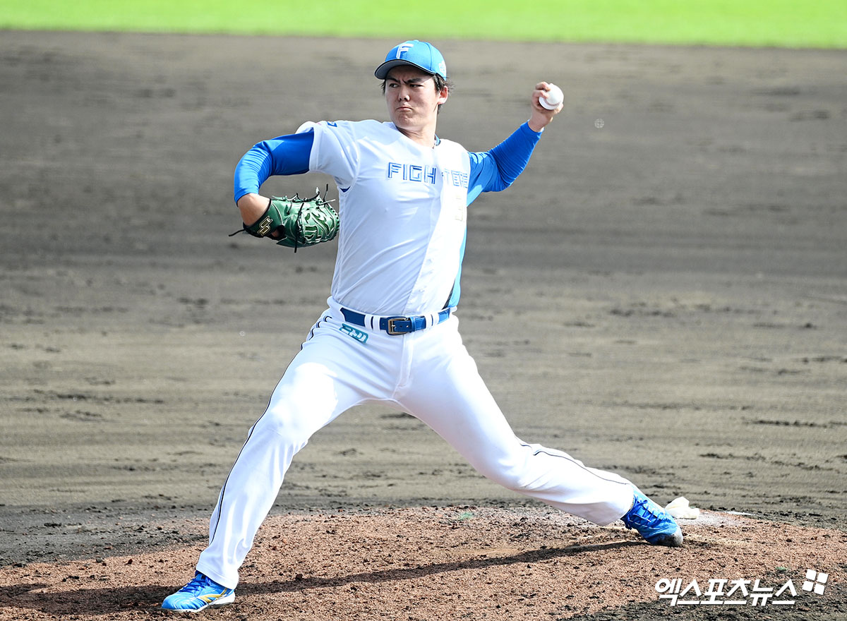 (엑스포츠뉴스 오키나와(일본), 고아라 기자) 26일 오후 일본 오키나와 나고시영 구장에서 열린 한화 이글스와 닛폰햄 파이터스의 연습경기, 8회초 닛폰햄 후지타 류세이가 공을 힘차게 던지고 있다.