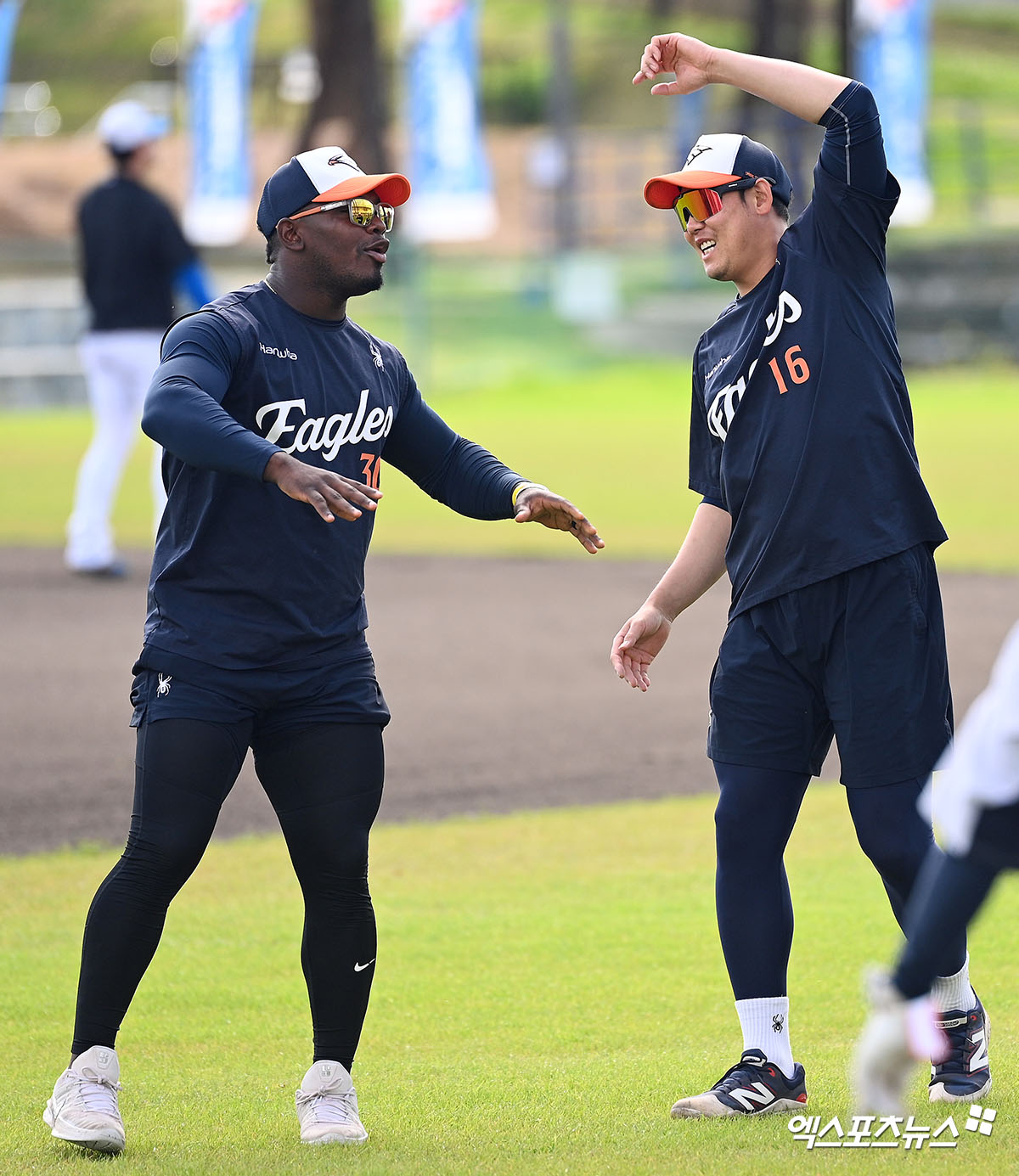 (엑스포츠뉴스 오키나와(일본), 고아라 기자) 26일 오후 일본 오키나와 나고시영 구장에서 열리는 한화 이글스와 닛폰햄 파이터스의 연습경기, 한화 페라자 하주석이 웜업을 하고 있다.