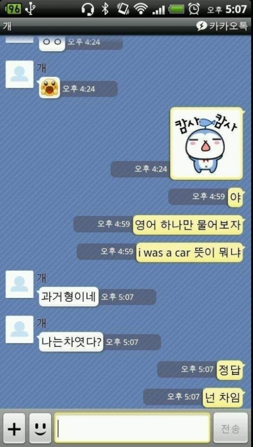 대화 중 한 사람이 "뭐 하나만 물어보자"며 ""'I was a car'가 무슨 뜻이냐"고 질문을 던지고, 상대방은 "과거형이네"라며 "나는 차였다?"고 대답한다.
