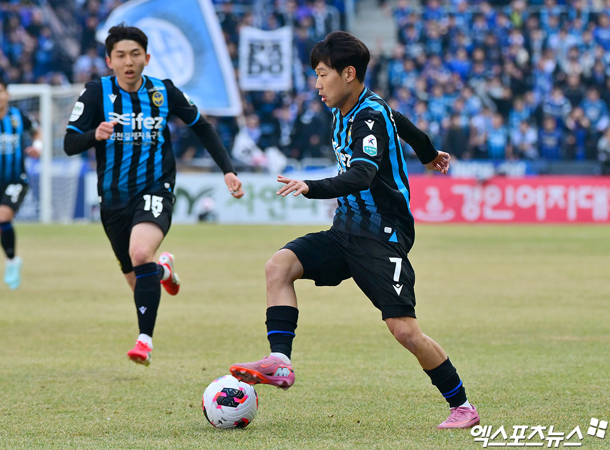 (엑스포츠뉴스 인천, 김한준 기자) 28일 오후 인천축구전용경기장에서 열린 '하나은행 K리그1 2026' 인천유나이티드와 FC서울의 경기, 인천 오후성이 돌파를 시도하고 있다.