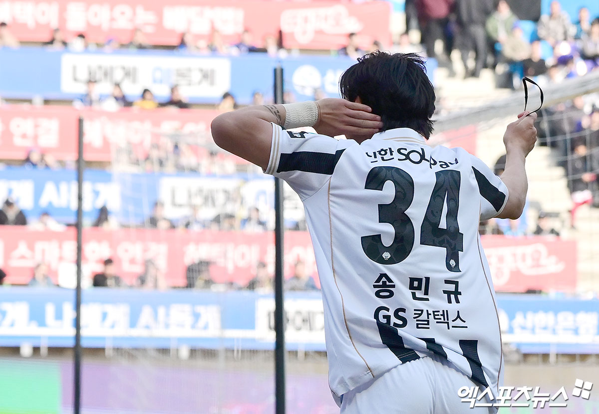 (엑스포츠뉴스 인천, 김한준 기자) 28일 오후 인천축구전용경기장에서 열린 '하나은행 K리그1 2026' 인천유나이티드와 FC서울의 경기, 서울 송민규가 선제골을 넣은 후 기뻐하고 있다.