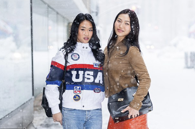 폭설이 내리는 영하의 날씨 속에서도 베이지색 코트와 오렌지색 가죽 스커트를 매치한 세련된 패션을 선보였으며, 미국 체조 금메달리스트 수니사 '수니' 리와 동행한 모습이 포착됐다.