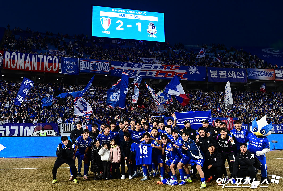 (엑스포츠뉴스 수원, 박지영 기자) 28일 오후 수원월드컵경기장에서 열린 '하나은행 K리그2 2026' 수원 삼성과 서울 이랜드의 경기, 수원이 2:1의 스코어로 승리했다.