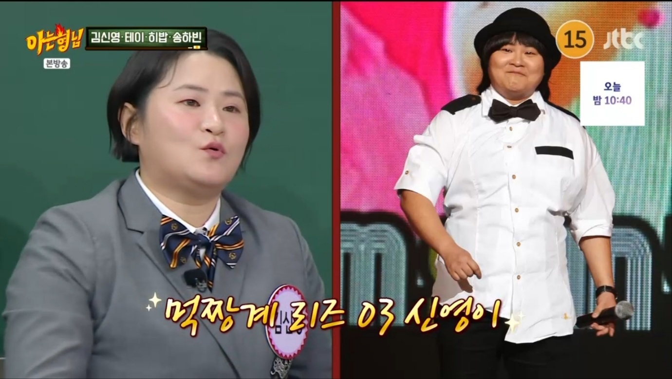 김신영은 "아, 03 신영이?"라며 먹짱으로는 리즈(?) 시절이었던 2003년을 언급했고, 당시 두 명이서 대패삼겹살을 64인분 먹었다고 답했다.