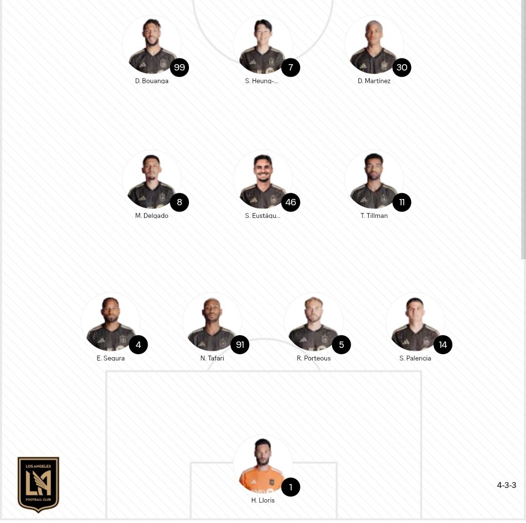 LAFC는 위고 요리스, 에디 세구라, 은코시 타파리, 라이언 포르테우스, 세르지 팔렌시아, 미첼 델가도, 스테픈 에스타키오, 드니 부앙가, 티모시 틸먼, 다비드 마르티네스 모랄레스, 그리고 손흥민을 선발로 내보낸다.